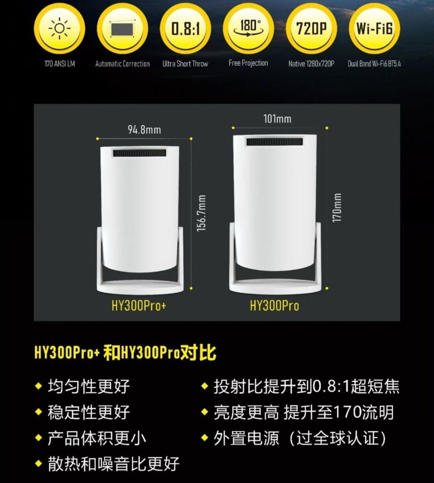 • 超短焦鏡頭,投射比例 0.9:相較 HY300 的 1.37,HY300Pro 能在更短距離內投射更大畫面,僅需 1.68 米即可投影 130 吋大螢幕