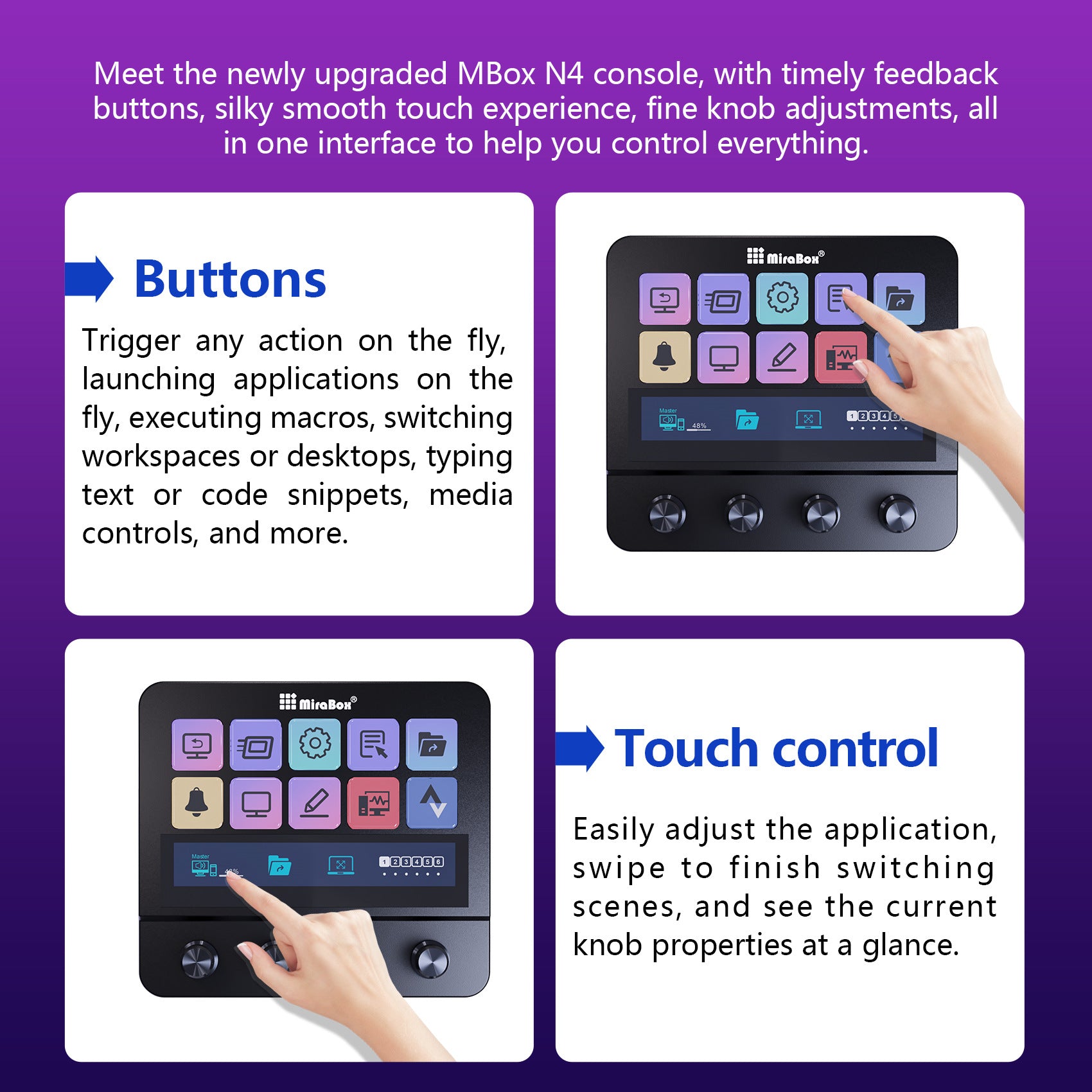 無論是直播、剪片、遊戲還是日常辦公,MIRABOX Stream Dock N4 都能助您輕鬆完成各項操作,提升工作效率。輕觸即開,快速切換,讓您的創作體驗更加流暢高效!